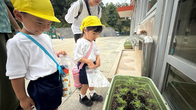 出発前にまずは、ほし組(年少組)さんが一生懸命育てているコスモスを観察♪