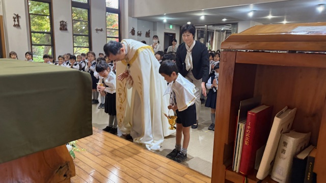 年長ばら組のお友達が侍者(神父様のお手伝い)を立派に務めてくれました。