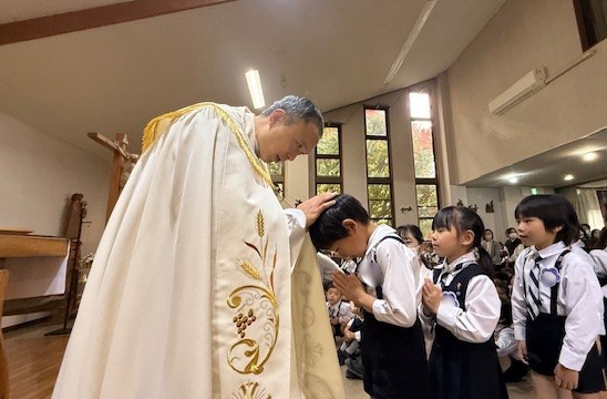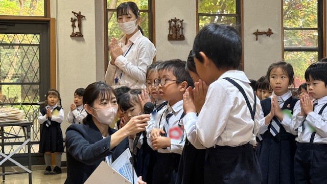 光塩日野幼稚園では、七五三のお祝いはカトリック高幡教会へ行き、神父様に祝福をしていただきます。