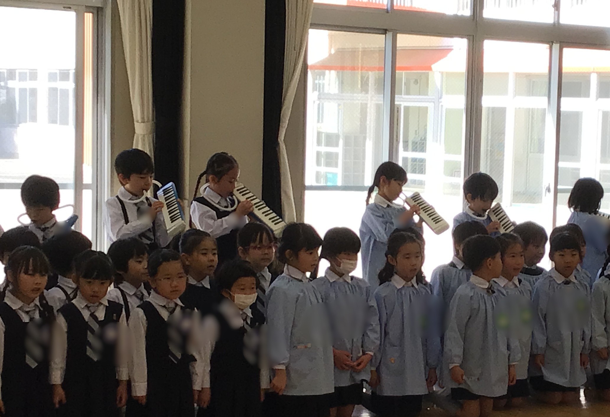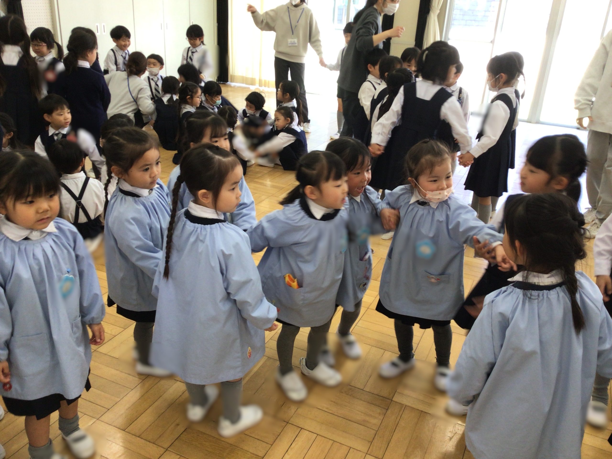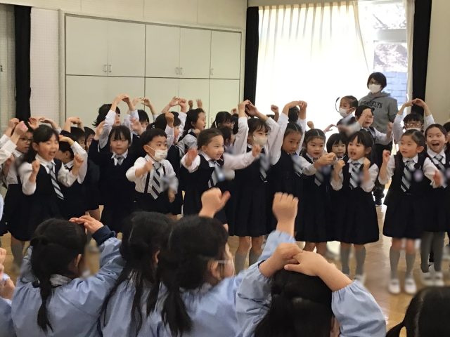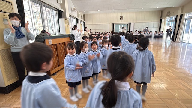 講堂にみんなで集まり、年長ばら組さんを拍手でお迎えするところから始まりました。
