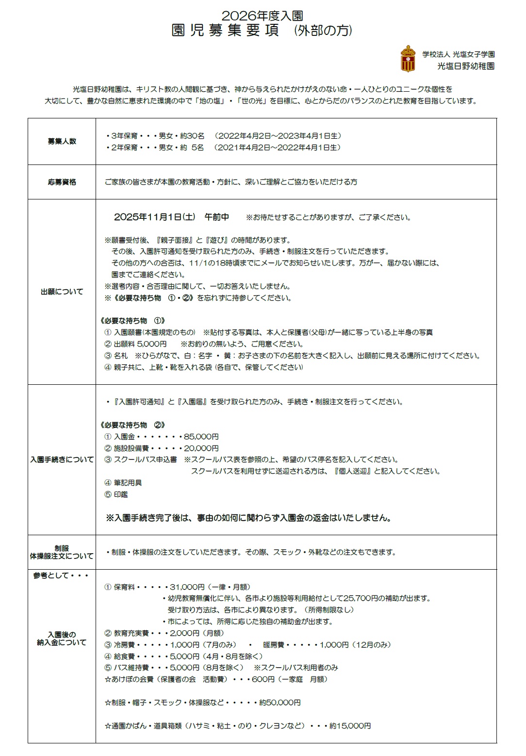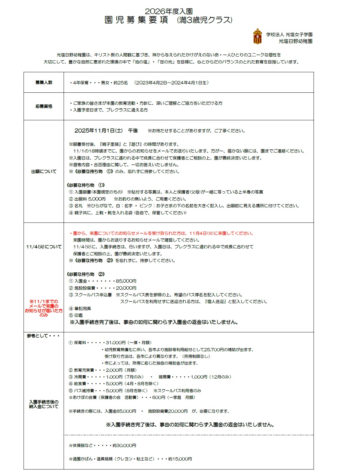 2026年度入園 3年保育(年少クラス)の募集要項です。